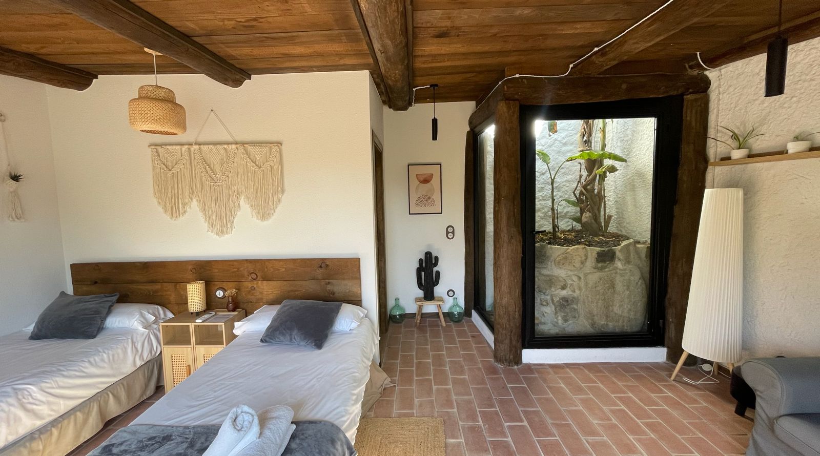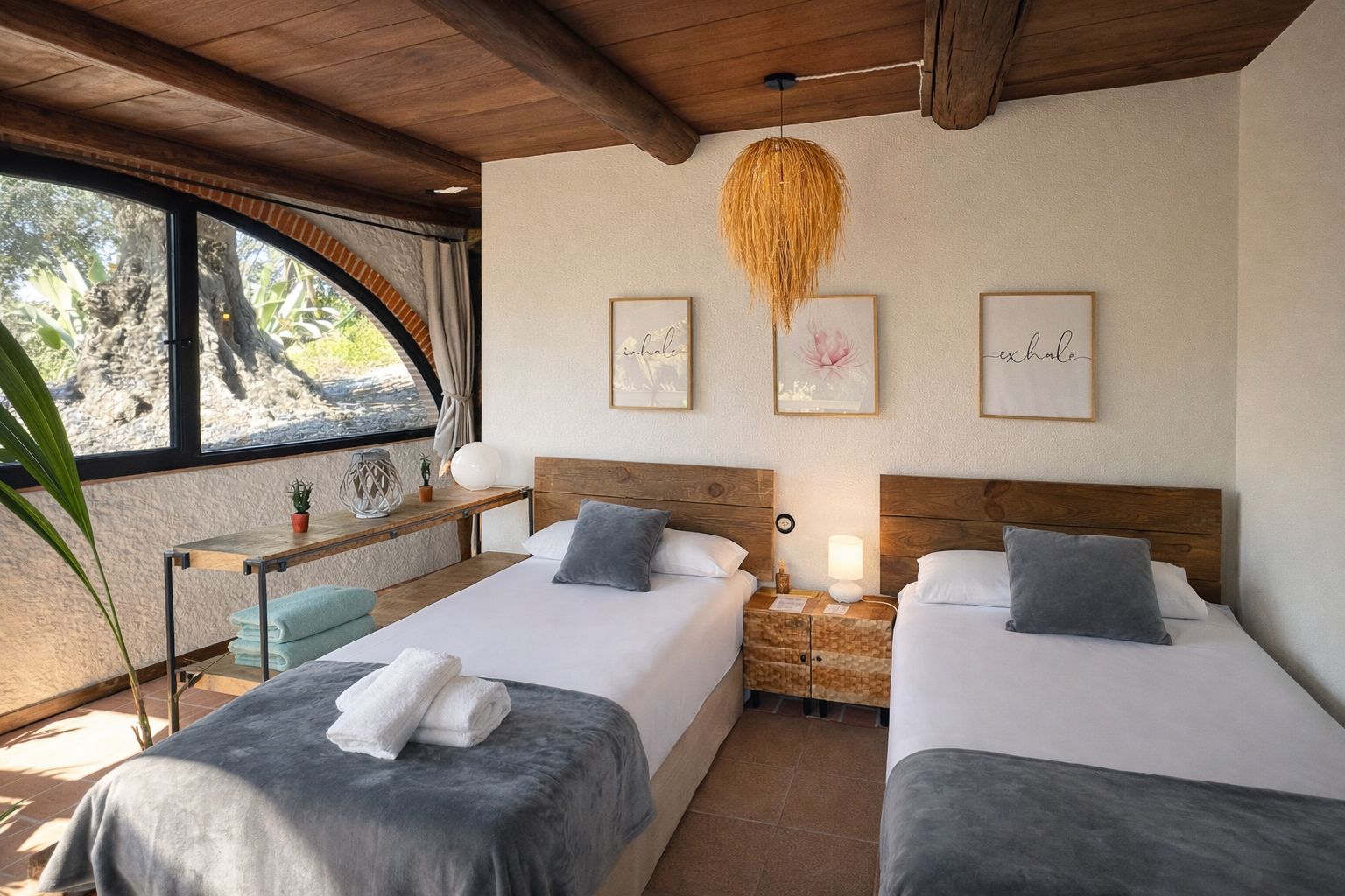 Este Edén cuenta con piscina con cascada rodeada de naturaleza, zona wellness con sauna de tubo, cueva con sauna infrarrojos y jacuzzi, habitaciones cómodas compartidas, todas con 2 camas individuales (excepto una con 4 camas separadas por un pequeño muro, garantizando intimidad), cada habitación cuenta con baño propio. Un entorno que combina comodidad, privacidad y belleza, perfecto para habitar el retiro de diosas que hemos creado.